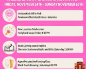 TONS to do this weekend, and the Holiday Kick-Off in Pink is in full swing! Bring some friends to come downtown and support local! See you there!! The Holiday Kick-Off in Pink continues today and tomorrow in Downtown Sheridan! Head to your favorite spots with your holiday shopping list ready!! Support local nonprofits by shopping at participating businesses on Saturday for Give Local! Hollyhock Swap is having their New Location Celebration this evening at 4:30 PM! Head over to 171 N Main Street downstairs for the ribbon cutting, live music by Luke Stroud and Bridgette Dillard, and celebratory sales and deals!! Saturday at 11 AM, Sheridan Stationery Books and Gifts is hosting author Jeanie Iberlin for a signing of her book ‘The Unbelievable Power of Feeling.’ Meet this incredible writer and discover her amazing works! The Paint Post and Black Tooth Brewing - Sheridan are hosting an Aspen Perspective painting class at 6 PM this Saturday. Sign up now for this brilliant session to sip some delicious brews and create a stunning Fall scene! Each ticket includes a free drink token. Don’t forget to send photos of your receipts from supporting local this weekend to 307-336-7595 to enter to win the DSA’s Holiday Shopping Spree! See you downtown!!